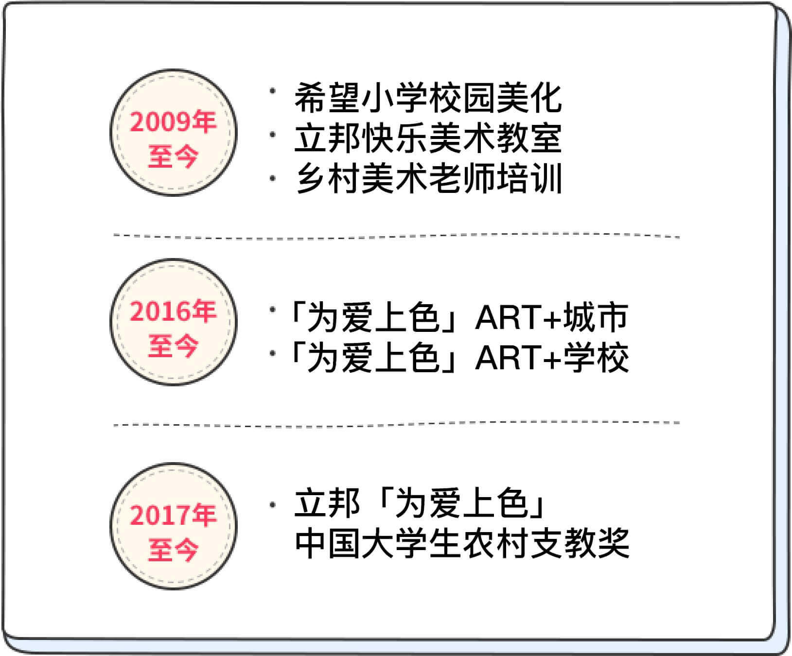 2017年,立邦中國加入共青團(tuán)中央學(xué)校部指導(dǎo)下發(fā)起的“中國大學(xué)生知行促進(jìn)計(jì)劃”,響應(yīng)建設(shè)“美麗中國”號召,結(jié)合“一帶一路”和“精準(zhǔn)扶貧”政策 ,開展“立邦「為愛上色」中國大學(xué)生農(nóng)村支教獎”,鼓勵全國高校大學(xué)生深入鄉(xiāng)村,開展助學(xué)支教、傳統(tǒng)村落建筑及文化遺產(chǎn)調(diào)研等實(shí)踐活動。